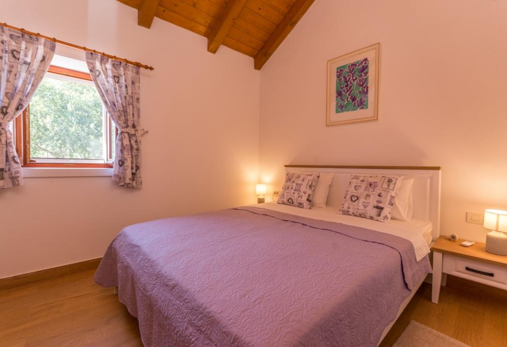 Im Obergeschoss befinden sich zwei geräumige Schlafzimmer mit Klimaanlage für 4 Personen: jedes mit 1 Ehebett (Breite 160 cm, Länge 200 cm), einem großen Badezimmer mit Badewanne/Dusche und WC und Rauchdetektor. Den Gästen steht auch ein Kinderbett zur Verfügung. Saubere Bettwäsche und Handtücher sind im Unterbringungspreis inbegriffen. Da ist auch eine offene Terrasse mit Blick auf den Olivenhain und grüne Felder. Design der Schlafzimmer vervollständigt modernes Design des ganzen Hauses mit rustikalen Elementen.